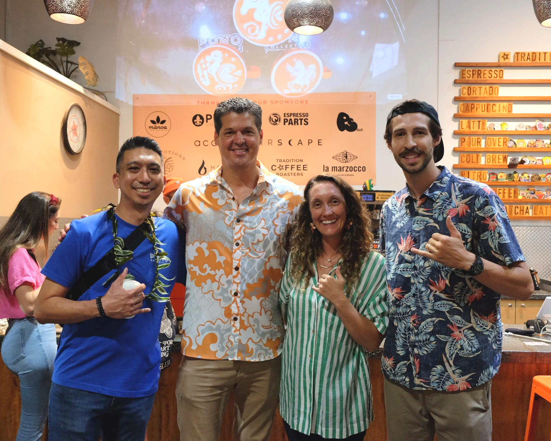 Celebrating a fun evening and incredible partnership! From left: Marc Marquez, Acting Executive Director of Pono Collective; Brian and Lindsey Burik, Owners of Tradition Coffee Roasters; and Sam Basarab, Throwdown Organizer and Barista of Tradition Coffee Roasters. Photo by Kimberly Oshiro